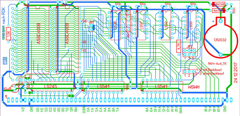 ![]() Ferner noch eine Mail vom Willy (Gourmet) Hallo Steffen! Es ist die Schaltung von Deff aus dem Thread Sonstiges -NDR Klein Computer techn. Fragen... Nr 348. Änderungen sind der gepufferte Adressbus mit 74LS541 oder DL541, sowie die Möglichkeit das /RD Signal bei Bedarf über ein Gatter des LS07 zu puffern. Dazu muß Jp4 gesteckt sein. Jp 3 muß zum ansteuern des LS245 auf 2-3 gesteckt sein. Wenn man das nicht möchte kann über eine Lötbrücke am Steckverbinder /RD und Jp3 1-2 die Ansteuerung ohne Pufferung vorgenommen werden. Ansonsten ist ja alles so wie bei dem Vorschlag den ich Dir mit dem 7432-74(LS)07 Modul gemacht habe. Zum besseren Verständnis schicke ich Dir im Anhang das Layout im Sprint Layout 6.0 Format der Leiterplatte. René hat allerdings einen Jumper auf der Leiterplatte anders beschriftet. Halte ich für wichtig! Nimm die auf dem Bestückungsaufdruck angegebenen 1N4148 und keine Schotkydioden. Kannst Du alles mit der Testfunktion des Layoutprogrammes verfolgen. Meine Leiterplatten von René waren am Steckverbinder etwas zu hoch, so das ich 5mm abschneiden mußte. Das vergleiche bei Dir noch mal bevor Du bestückst. Willi PS.: ...ich wars doch nicht, aber beteiligt. |