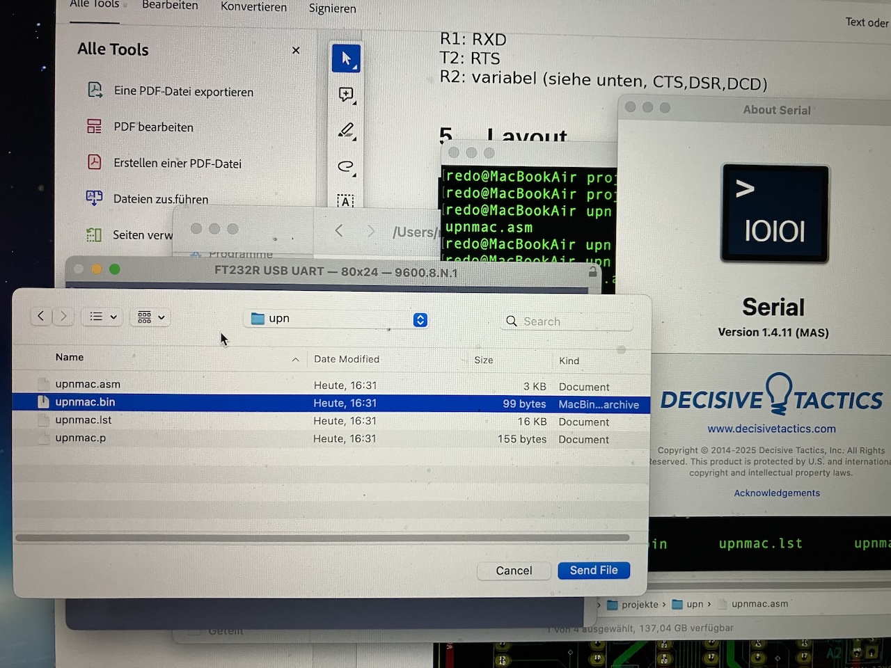 mit Unterstützung von Steffen.111's GP-EDAS.50ab und dem SER.700 Programm konnte ich jetzt meine SER für die Datenübertragung von assemblierten Programmdateien vom PC (MAC Macbook mit Sequoia 15.6 und SERIAL V 1.4.11) verwenden. Als zusätzliche Hardware verwende ich einen FT232R UART USB-to-TTL Adapter mit der Möglichkeit, RTS/CTS zu verarbeiten. Das sieht bei mir dann so aus. ![]() Im SER.700 Programm gibt es einen undokumentierten Befehl # zum Übertragen von Daten vom PC. Über das # Kommando im SER.700 gelangt man zur Eingabe des Adressbereiches: ![]() Nach der Eingabe der Adresse startet das Programm und wartet mit dem Kommentar "starten" auf die Übertragung. Auf der Gegenseite (hier mein MAC mit dem SERIAL Programm, konfiguriert für den USB-TTL Stick mit 9600, 8N1, RTS/CTS aktiv) wird die mit dem Arnold Assembler compilierte BIN Datei als RAW-File mit dem Kommando "Send File" übertragen: ![]() Nach der Übertragung wird am NKC (ich habe noch ENTER gedrückt in der Annahme, dass damit die Übertragung als abgeschlossen gewertet wird, zeigt das SER.700 den CRC für die Übertragung an. Nach Rückkehr ins Menü des GP-EDAS kontrollierte ich noch den Erfolg der Übertragung mit dem Hexdump: ![]() Die Übertragung war vollständig und der anschließende Programmstart meines Übungsprogramms über das Hauptmenü der GP-EDAS mit "g" und der Startadresse 9800h klappte einwandfrei. Ich habe mich über diese Möglichkeit im SER.700 gefreut. Damit kann ich jetzt auf meinem MAC mit VSC und AS entwickeln und bekomme die BIN'S schnell in den NKC zum testen. Danke nochmal an alle, die mir mit Rat und Tipps geholfen haben. VG Jürgen ----------------------- Nach vielen Jahren ging es mit dem NKC wieder los.... Sehr spannend! |