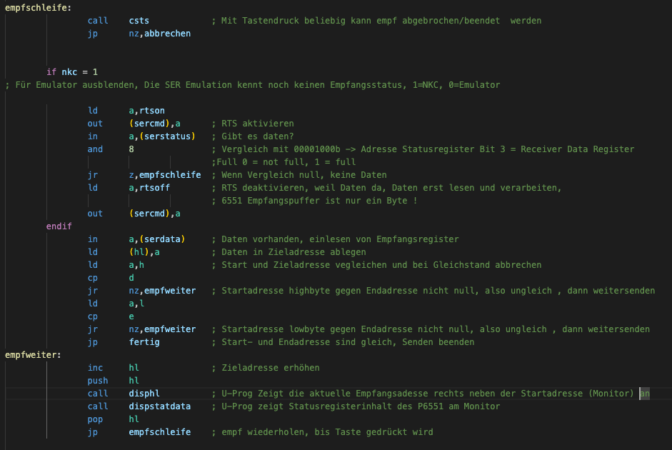 Ich hab ein ser. Transferprogramm für den 68k NKC (für die SER1 mit 6551) geschrieben. Die PC Seite via Python Programm und am NKC via Assembler. https://github.com/avg67/nkc/tree/main/SW/Python_dl Funktioniert in beide Richtungen um Files hin und her zu schicken. Steht schon länger auf meiner Todo- Liste das mal auf den Z80 zu portieren. Wenn Bedarf besteht erstell ich mal eine genauere Beschreibung wie das ganze intern funktioniert. LG Andi |