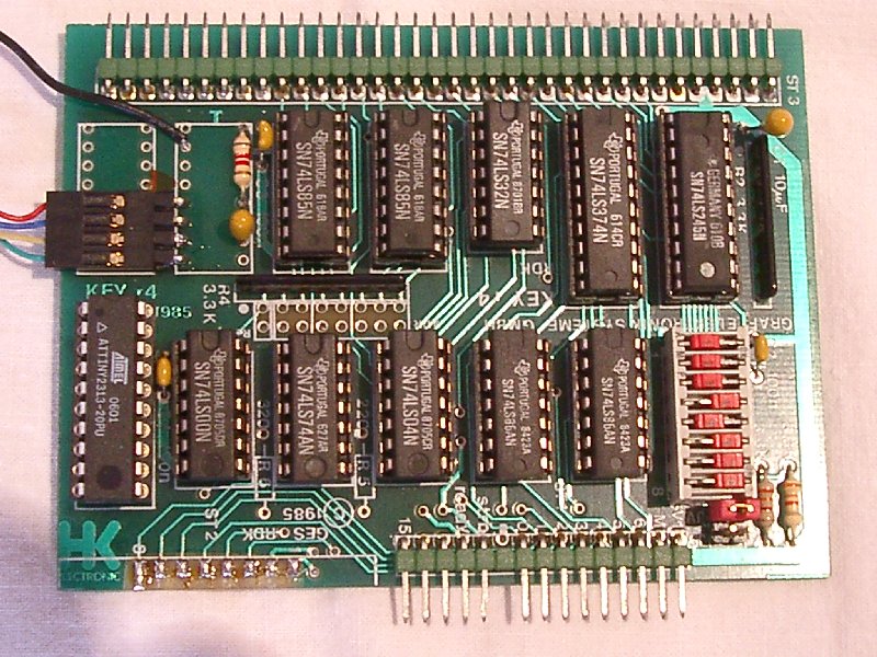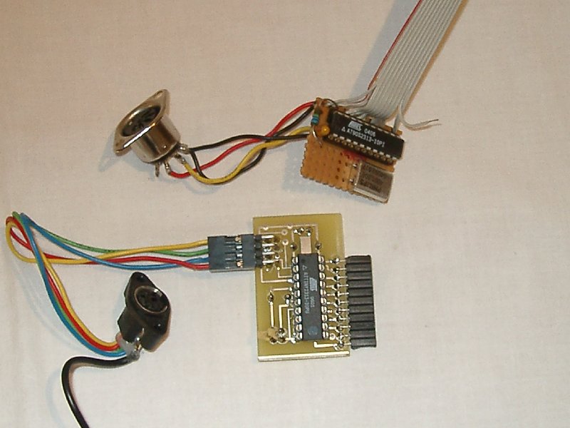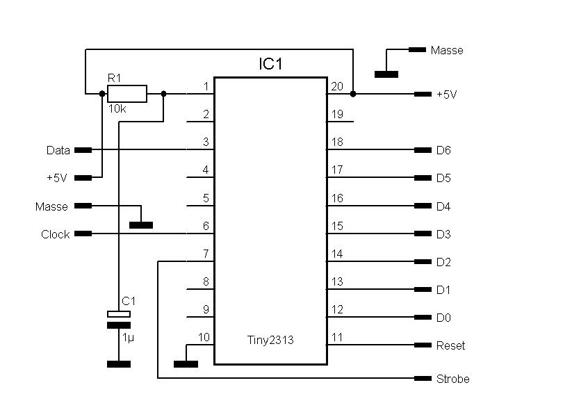Diese Schaltung ermöglicht es eine PC Tastatur am NKC anzuschliessen. Diese Schaltung basiert auf einem Atmel 2313, welcher nicht mehr hergestellt wird. Der Nachfolgetyp Tiny 2313 funktioniert aber genauso gut, hat den Vorteil, das man den Quarz einspart.Wie man sieht kann der Atmel auf der Key mit aufgebaut werden Es ist aber auch ein Aufbau einer externen Platine möglich Einige Sonderfunktionen sind mit eingebaut: So ist eine Tastaturkombination für den Reset implementiert. Alt F4 = ^KX = Ende Editor ^Pos = ^QR = Datei Anfang ^Ende = ^QC = Datei Ende Alt S Alt F3 = ^QF = Suchen Alt W F3 = ^QA = Ersetzen Alt Pos = ^QB ^KB = Blockanfang Alt Ende = ^QK ^KK = Blockanfang Alt H = ^QH ^KH = Blockmarken löschen Alt C = ^KC = Block Kopieren Alt V = ^KV = Block verschieben Alt Y = (^KY) = Block löschen Alt B = ^KS = Block auf Diskette schreiben Alt L = ^KL = Block von Diskette laden Alt T = ^KT = Text auf Diskette schreiben Alt I = ^KI = Dir Diskette Alt R = ^KR = Lesen Alt F = ^KW = Schreiben F2 Alt A = ^KA = Assembler Strg ESC = Hardware Reset